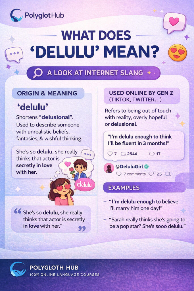 Otro uso frecuente de delulu se da cuando alguien interpreta señales ambiguas de forma excesiva. Por ejemplo, pensar que alguien está interesado románticamente solo porque dio un “like”, sonrió o respondió un mensaje con entusiasmo.